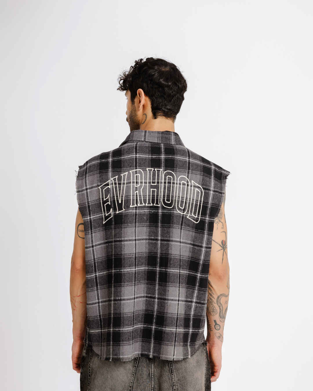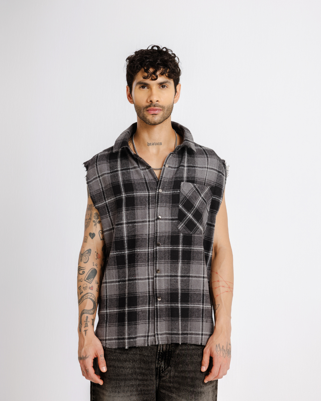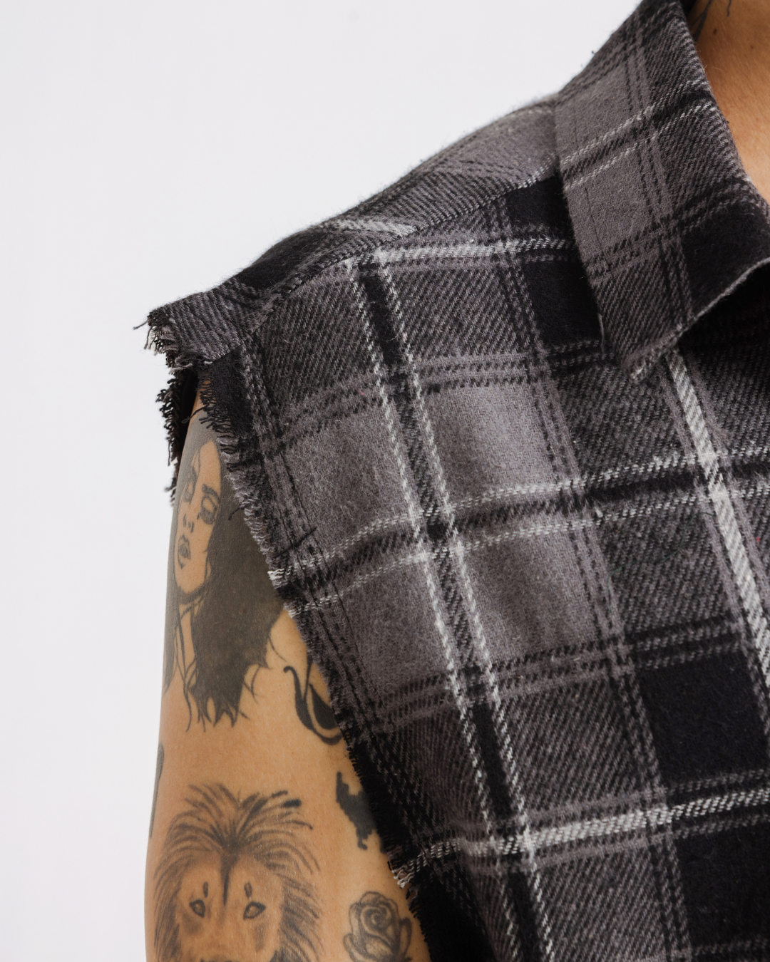 Grey chequered. City steel attitude. Distressed, sleeveless, and cut from soft cotton-brushed flannel — this piece blends rugged street style with everyday wearability. The raw edges and worn-in look give it a lived-in, ready-for-anything vibe.