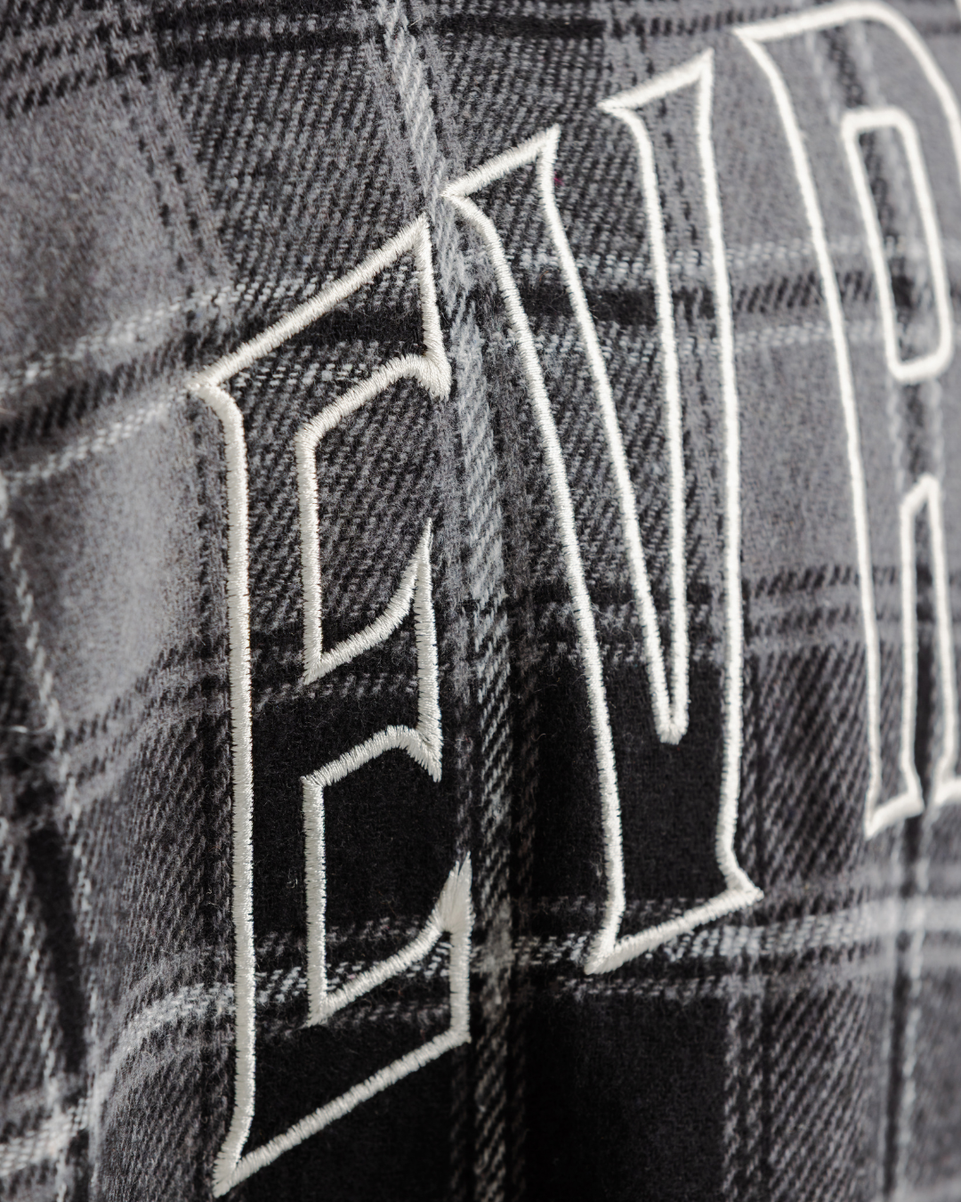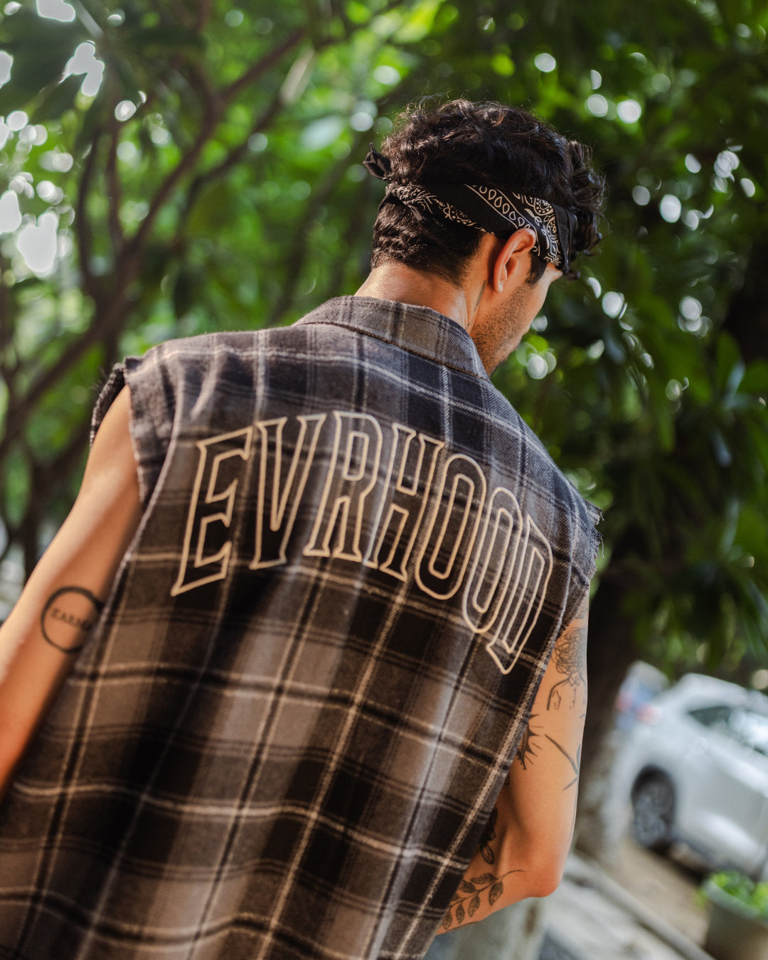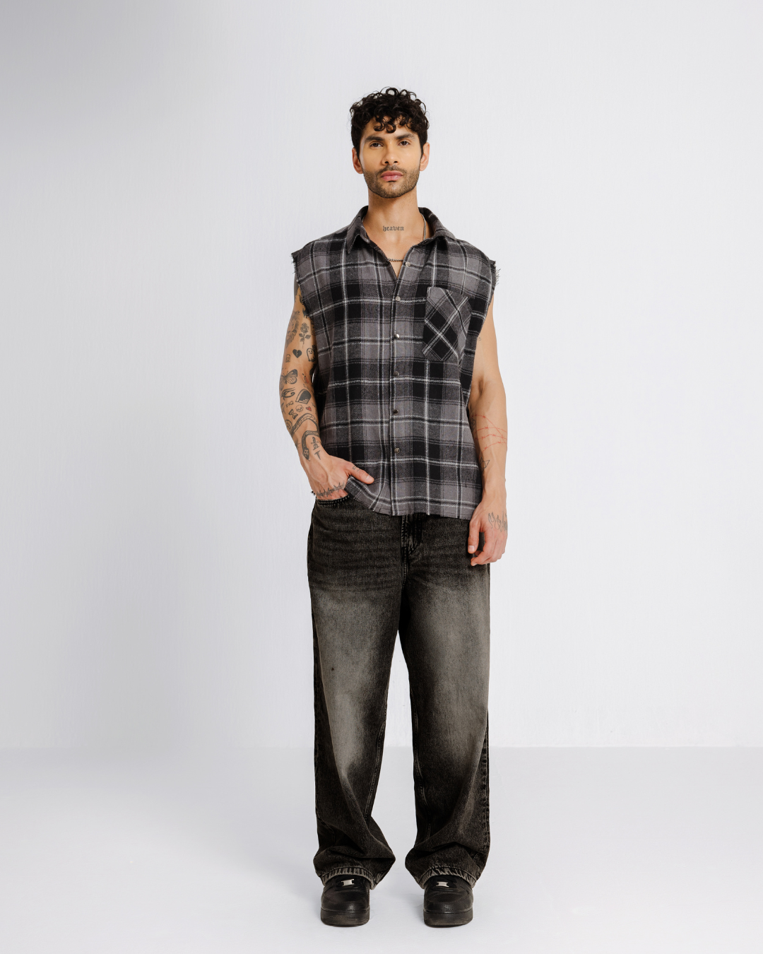 Grey chequered. City steel attitude. Distressed, sleeveless, and cut from soft cotton-brushed flannel — this piece blends rugged street style with everyday wearability. The raw edges and worn-in look give it a lived-in, ready-for-anything vibe.