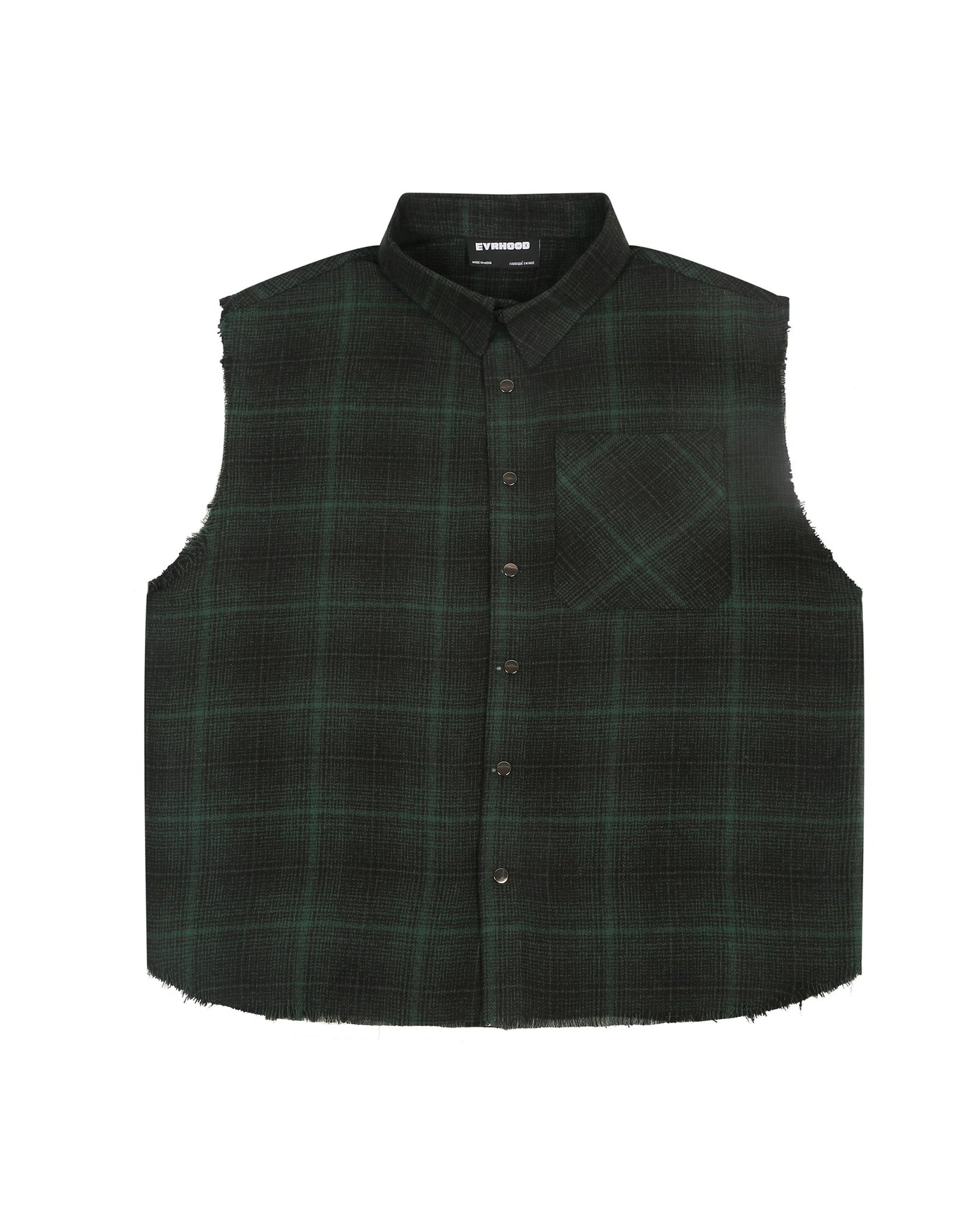 Green chequered. Nature, but make it bold. Distressed, sleeveless, and cut from soft cotton-brushed flannel — this piece blends rugged street style with everyday wearability. The raw edges and worn-in look give it a lived-in, ready-for-anything vibe.